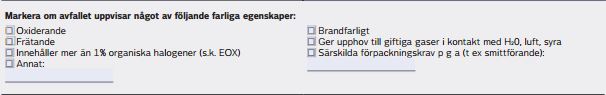 - Ange vilka egenskaper avfallet har. Fyll i det som ni känner till. Om det finns ett säkerhetsdatablad eller analys på avfallet, skicka med det som bilaga. Detta underlättar för oss vid bedömning hur avfallet ska och kan hanteras.
