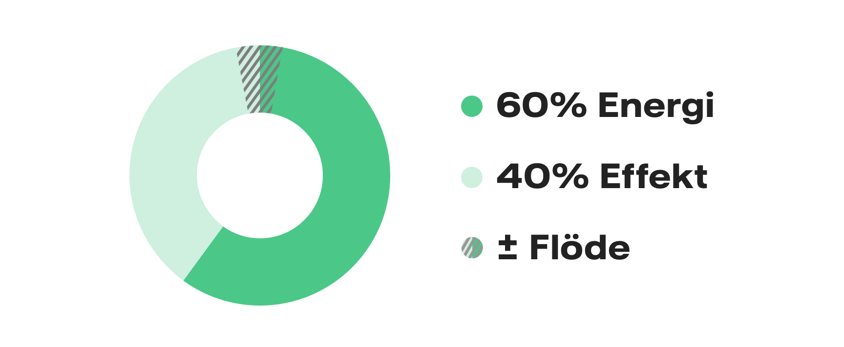 Prismodellen består av tre delar: effekt, energi och flöde. Generellt kan man säga att energidelen står för 60 procent av kostnaden och effektdelen för 40 procent. Flödesdelen, som tar i beaktning hur effektiv din värmecentral är, kan vara antingen en premie (avdrag på fakturan) eller en kostnad.